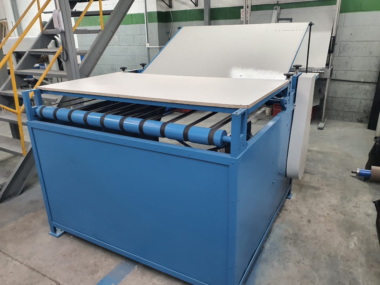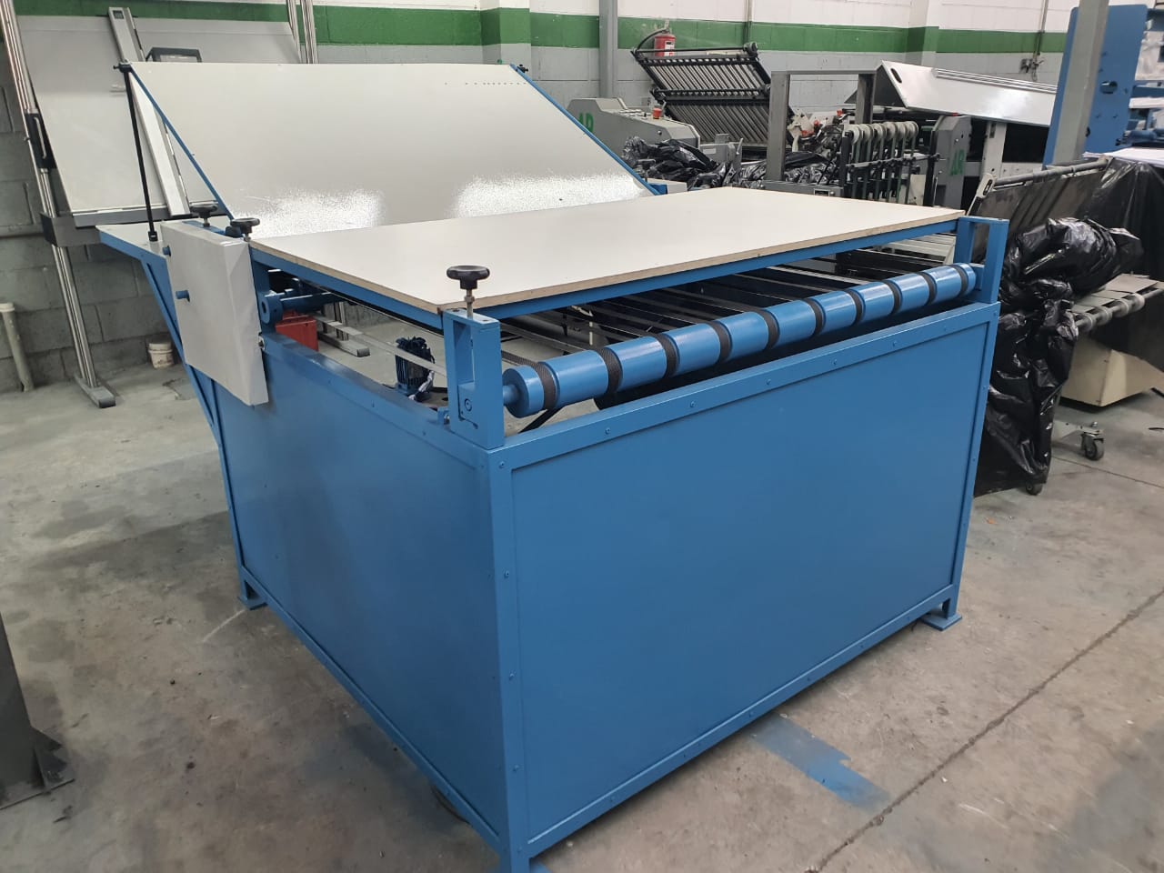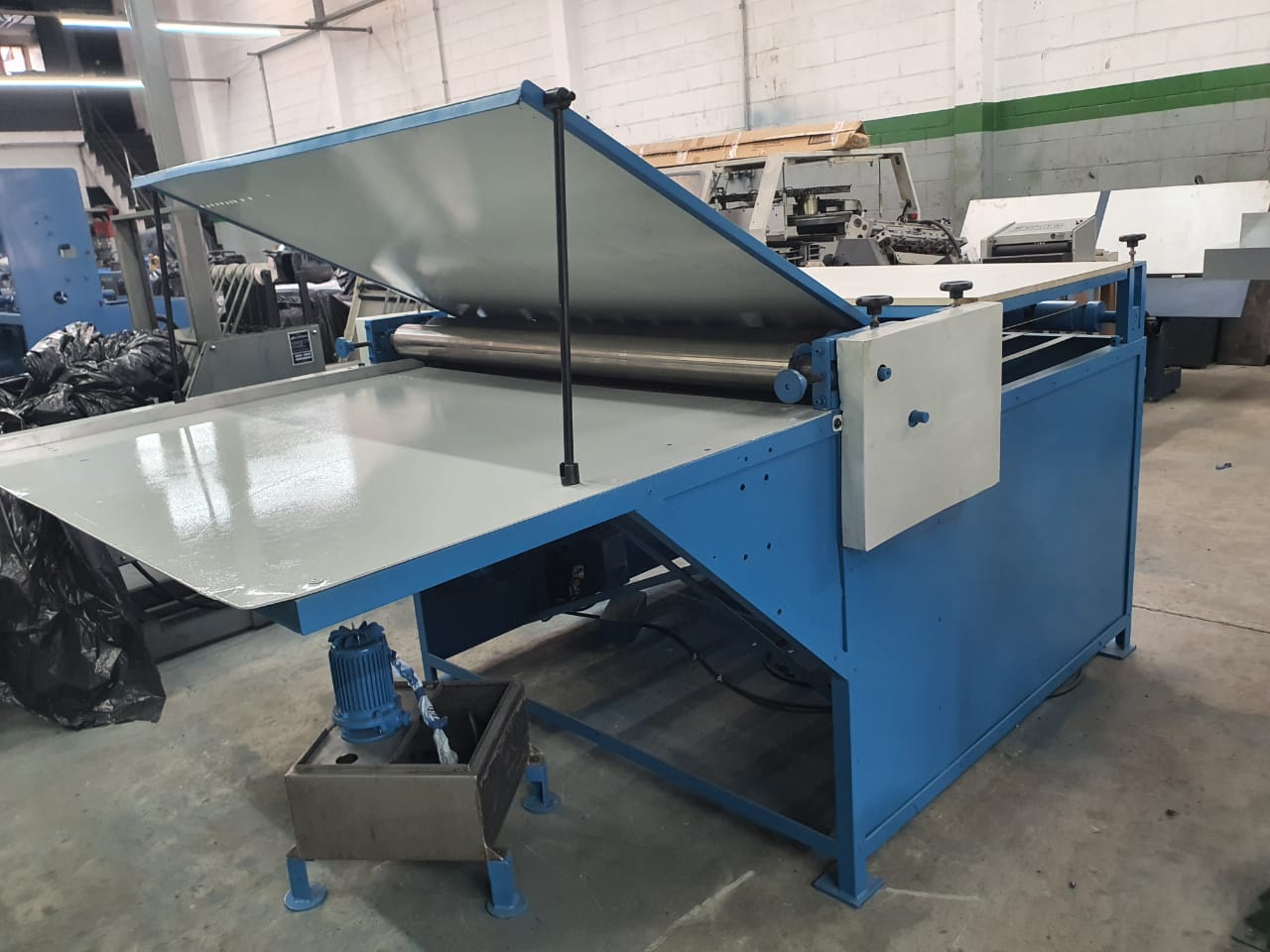 Acopla papéis impressos ou não, com folhas de papelão micro-ondulado,formato: 1,40 cm de boca, prensador na saída, bomba de circulação de cola.